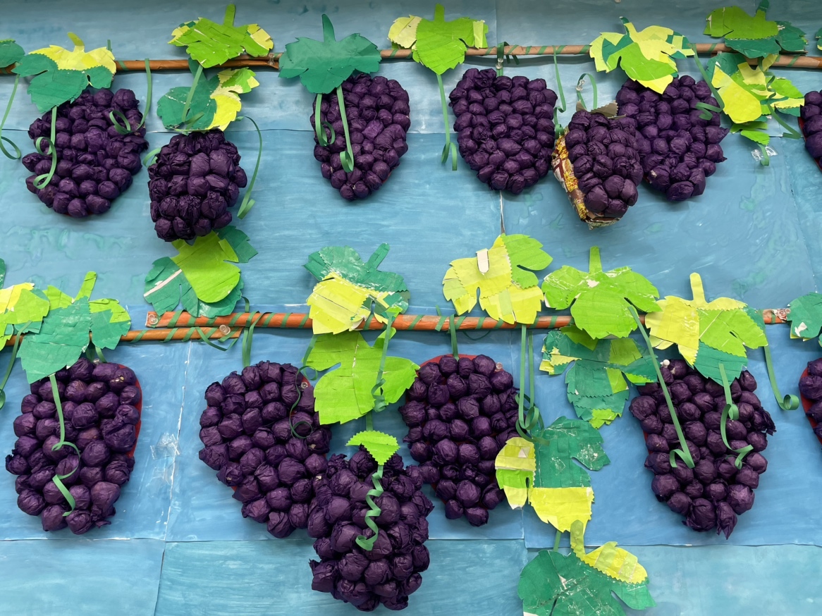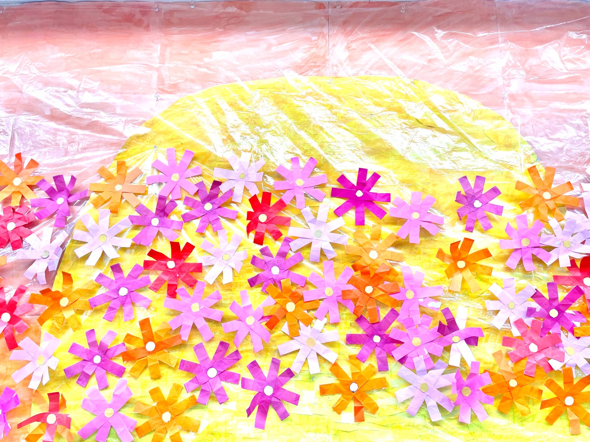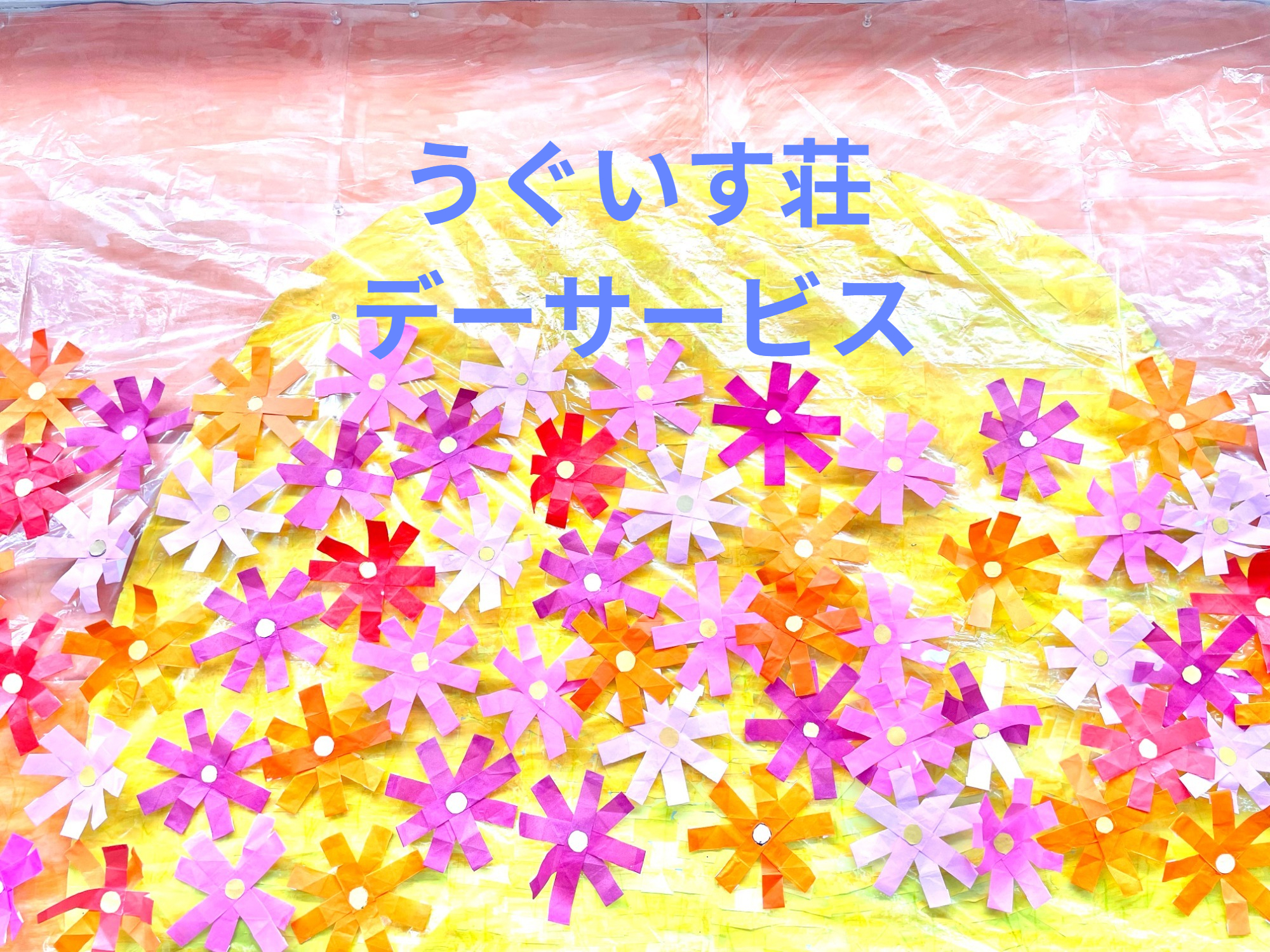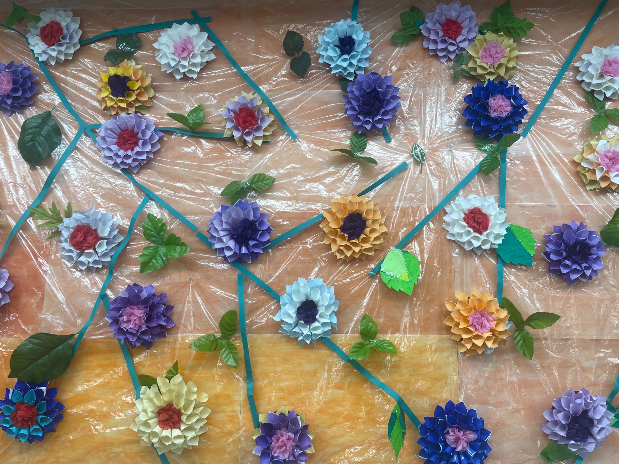 10月に行った行事の一部を紹介します。10月の壁画制作ではダリアの花を作りました。一つの花に花びらが沢山あり、とても沢山の花びらをご利用者様が作って下さいました。そのお陰でダリアの花がいっぱいできました。完成した作品をみて皆さん「綺麗やな~」と言われておられました。