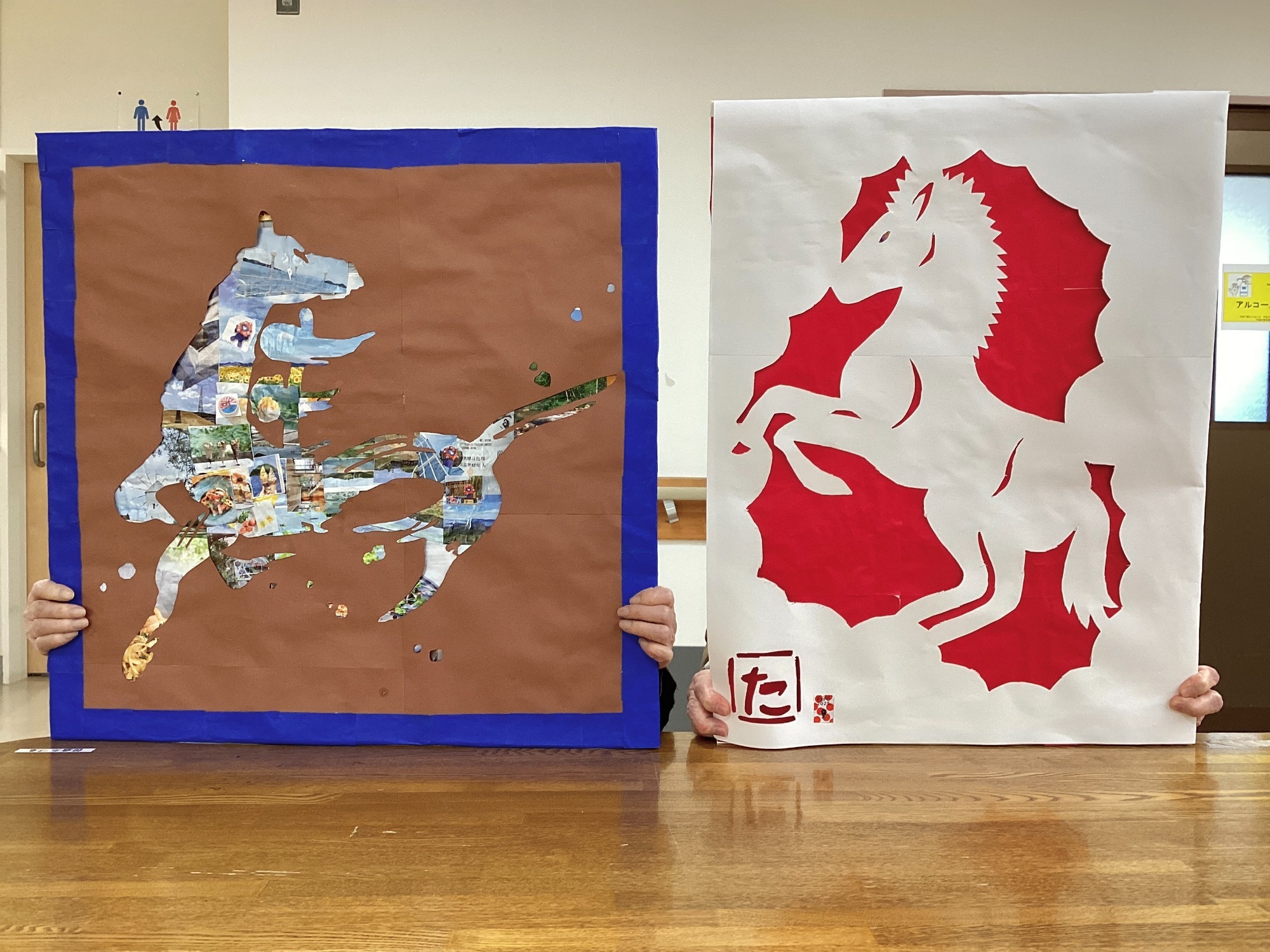 来年の干支「午」をテーマに、職員とご利用者様の共同作業で2つの作品が完成しました。